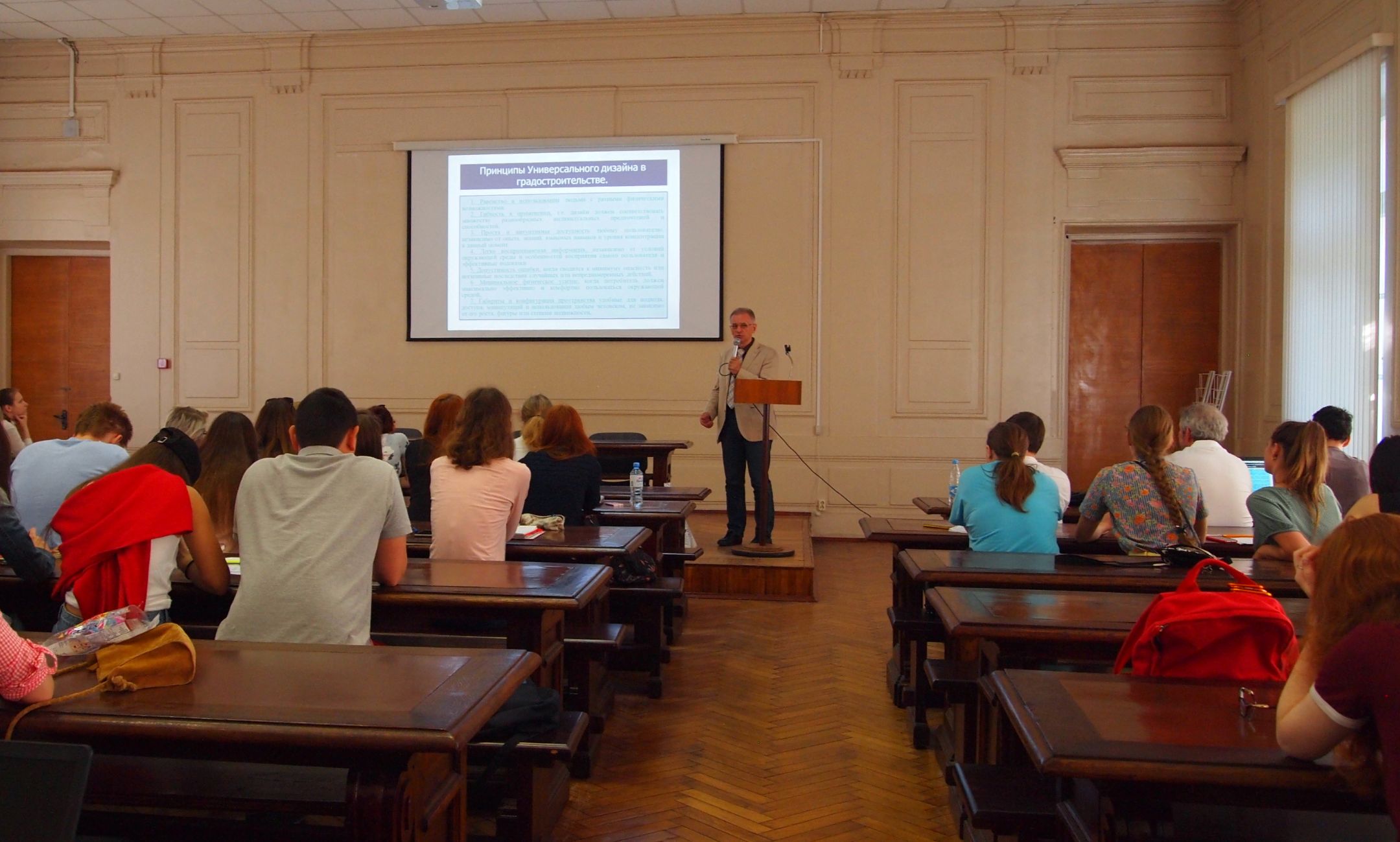 От согласованной темы – об адаптации объектов исторического, культурного и архитектурного наследия пришлось сразу отойти, так как студенты попросили познакомить из в целом с основами безбарьерного проектирования. Хотя слушателями были студенты 4 курса, в ходе лекции выяснилось, что системными знаниями по данному вопросу они не обладают.