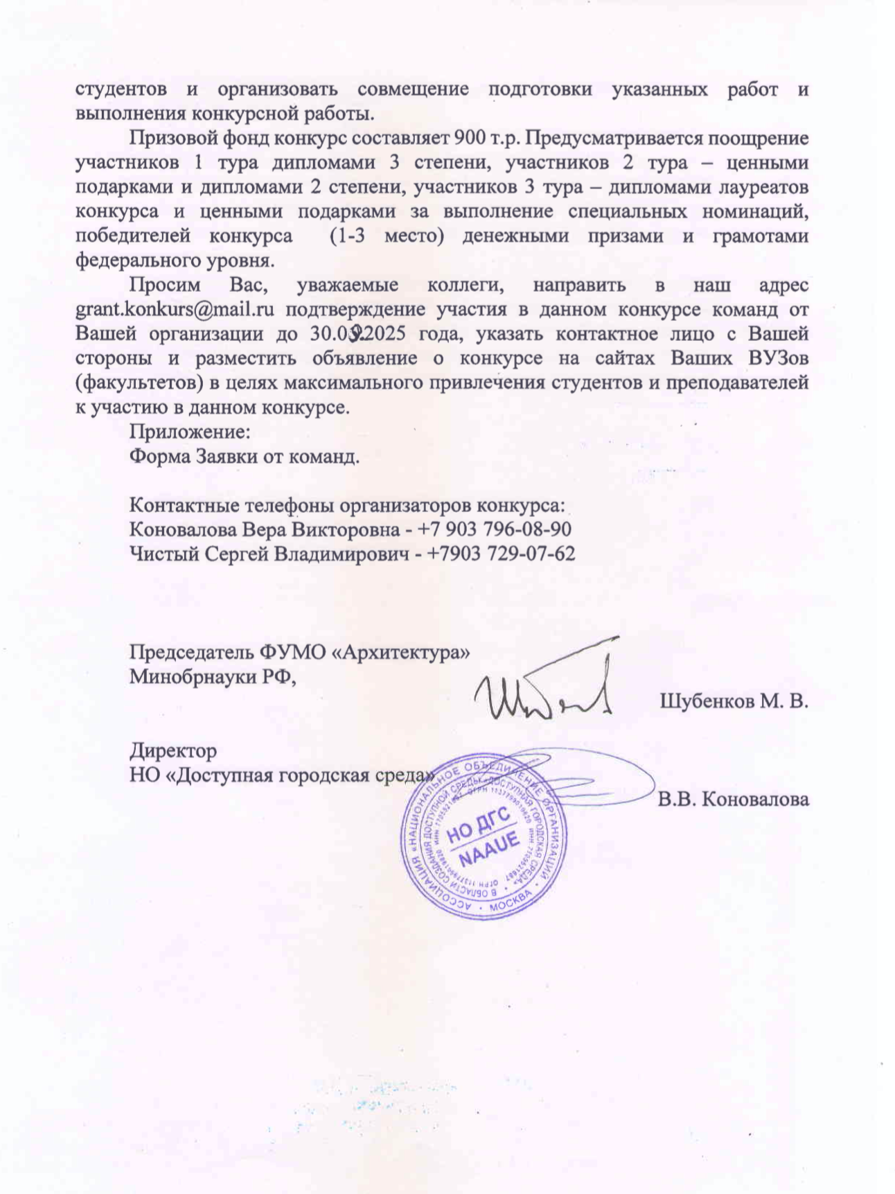 Ещё раз приглашаю Вас принять участие в нашем конкурсе и получить от него всё – знания, опыт командной работы, общение с ведущими экспертами страны и мира, вкус к решению сложнейших проблем развития городов, гордость от участия в нашем конкурсе, радость побед и официальное признание Ваших заслуг в виде грамот и дипломов профильных министерств и ведомств, создающих безбарьерную городскую среду.