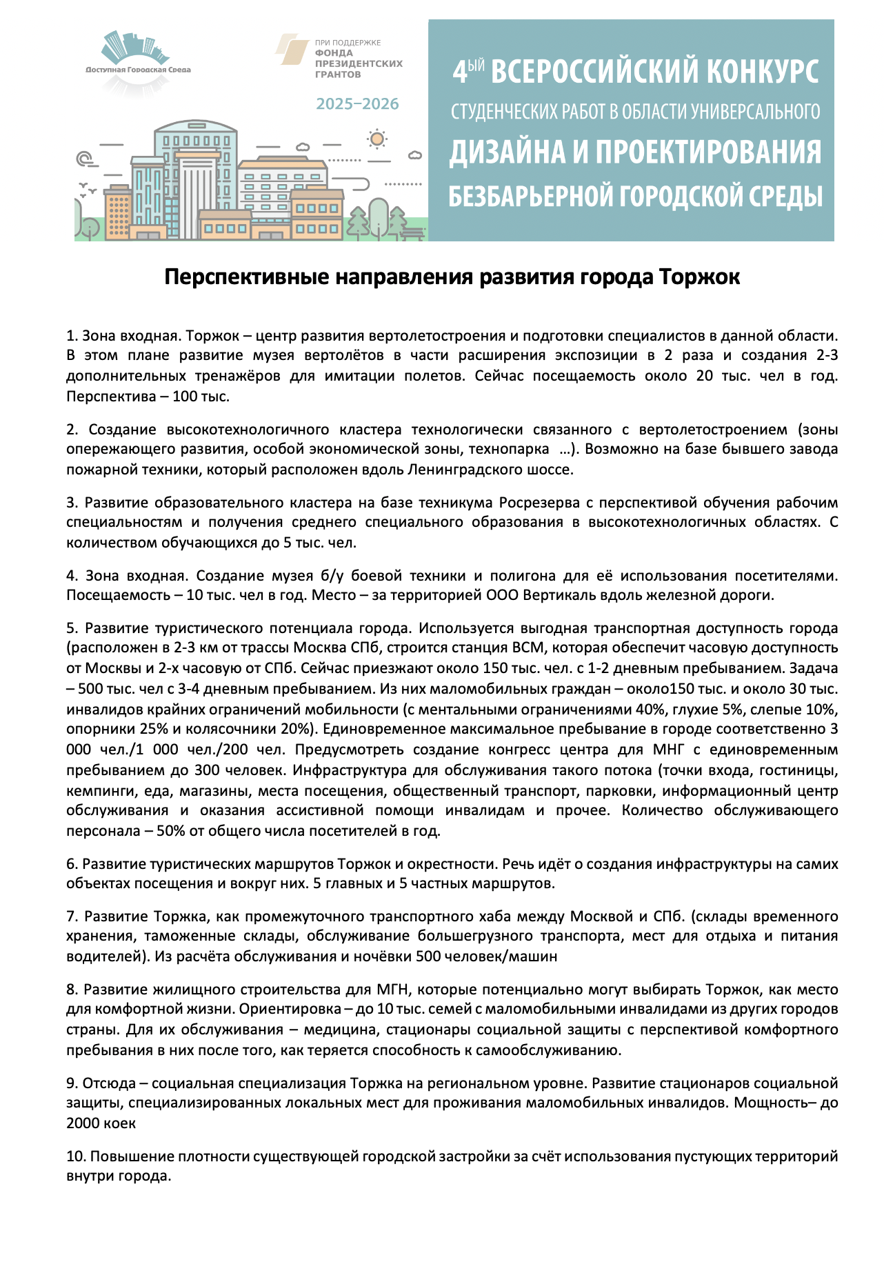 "Уважаемые студенты! Начинается конкурс по универсальному дизайну для города Торжка. Вас ждёт не просто проект, а возможность изменить город к лучшему. Не бойтесь множества правил и терминов — важнее понять суть. Подумайте о пространстве, где удобно всем: вашим родителям, вам, вашим детям. Там, где каждой детали хватает логики и тепла. Создайте место, в котором нормы превращаются в комфорт, а проект — в жизнь. Пусть Торжок станет городом, дружелюбным к каждому!"